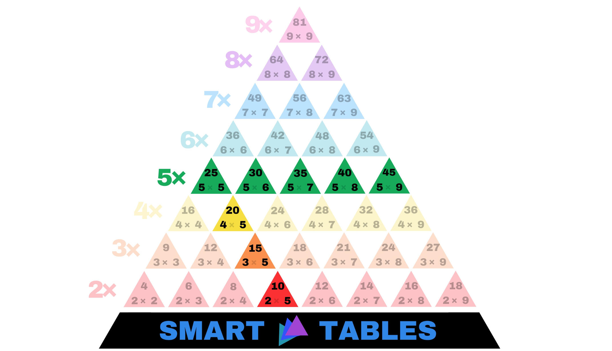 In this step your child will use the easy 5× number pattern to learn the 5× triangles - first in order, then reverse, then at random.Note that the 5× triangles include the 2×5, 3×5 and 4×5 triangles as shown below.